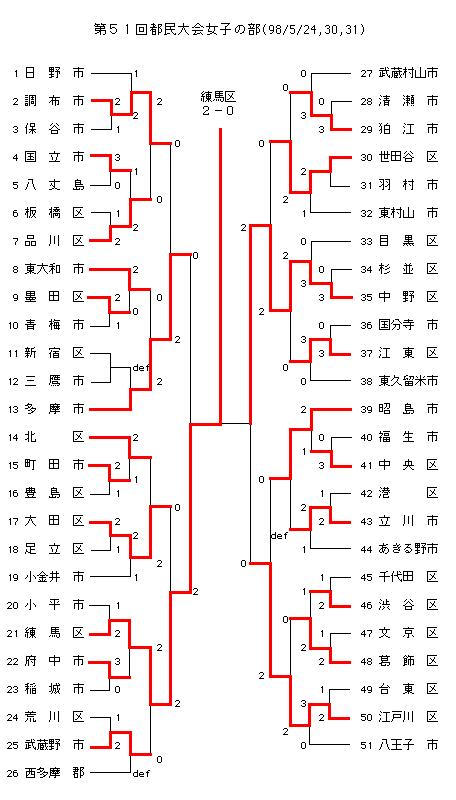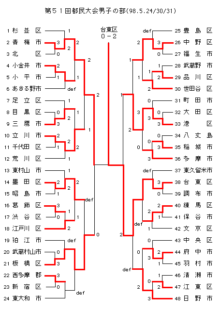 1回戦 青梅市 3−0 北区旭 輝久 (関塚・小鷹 8−1/楢原・旭(匡) 8−4/福田 8−5) 朝6時30分に青梅を出発。曇り空を気にしながらの有明までのドライプ。 1回で負ける訳にはいかないと、選手の意気込みが結果となって現れた様です。 特に関塚・小鷹ペアのはつらつとしたプレーが印象に残った試合でした。 2回戦 青梅市 2−1 杉並区 (関塚・小鷹 8−5/楢原・旭(匡) 8−2/福田 4−8) 今にも雨が降ってきそうな中で試合。 ダプルス1試合目の関塚・小鷹組。順調な滑り出しで7−2とリード。 しかし空から落ちてきた雫と共にブレーが怪しくなってきた。 7−4と追い上げられジュースとなったところで雨で中断。 暫く待機をするが結局2日目に延期。(後2ポインとなのに・・・) 30日に前回の続きから試合開始。 レシープ2本で終わらせる予定が逆になりゲームを落とす。 木曜日のナイターでリターン練習していたのに・・。 最後は小鷹君がサービスをキープ。よかった、よかった。 続く楢原・旭ペア。 この大会で初めてペアを組んで試合に臨んでいるのですが、 1回戦ではもう1つ歯車が合わず心配をしていたが、この試合では、 楢原さんのリードで若い旭(匡)君が伸ぴ伸ぴとプレーする様になり完勝。 試合が決まってからの試合となったシングルス戦。 福田君は次の試合の調整を兼ねた様子でゲームを推し進めて見た目には楽勝かな? と思っていたら相手が楽勝(予定外の結果)で負けてしまいました。 まあ消化試合だから・・・・・。 3回戦 青梅市 2−1 小金井市 (関塚・小鷹 7−8/楢原・旭(匡) 8−1/福田 8−3) ベストエイトを目指し多摩地区の強豪小金井市と対戦をする。 ダプルス1試合目、関塚・小鷹組は小鷹君のサウスポー独特のサービスで ゲームをリード。 7−5とあと1ゲームを取れれば勝てるところまで相手を追い込みながら、 気持ちの優しい関塚・小鷹ペアは相手に勝利を棒げてしまう。情けない。 続く楢原・旭(匡)ペア。前の試合でお互いの動きが理解出来る様になり 強力ペアに変身。危なげなく勝利を納める。さあ1対1でシングルスで勝負。 福田君の対戦相手は松浦さんといって前に1度対戦した事がある人で負けた事 もある相手。しかし前の試合で調整していた事が生きて、良いペースでゲーム を推し進めていく。勝った瞬間全員で大喜ぴをする。さあベストエイトだ。 段々自信が沸いてくる。ちょっと心配なのは、関塚君のサービスゲーム。 (まあいいか。) 4回戦 青梅市 2−0 立川市 (関塚・小鷹 8−5/楢原・旭(匡) 8−4) 相手が立川市に決まる。前に借敗をしている相手、雪辱戦である。 しかし立川市もメンバーが揃っていないみたい。チャンスである。 (立川市のメンバーには前に青梅市に住んでいた上念さんがいる。 もう幾つになるのかなあ?)第一試合、関塚・小鷹ペア調子がいい。 5−0とリード。楽勝と思った時から立川市の逆襲にあう。 あっとゆうまに5−5。これはいけないと思い2人に一括。 (格好いいテニスで勝てる相手ではない。 もう少し気合いを入れて勝負に執着する様にと) この檄が効いたのか2人のプレーに活気がでてきた。 後は押せ押せで何とか勝利を得る事が出来る。まず1勝だ。 続く楢原・旭ペア、立川市のベテランペアの上念組を圧倒し勝利をおさめる。 シングルス戦を闘わずしてベスト4だ。 準決勝 青梅市 2−0 板橋区 (福田・小鷹 8−3/楢原・旭 8−2) いよいよベスト4試合前に関塚監督と楢原選手が作戦会議。 前の試合で板橋区のシングルスの選手の試合を見て、青梅市のどの選手より 力が上である、シングルスを捨てた方がいいのではないか? そしてダプルスを2つ勝ちにいく作戦を立てる。 相手とオーダー交換をした時、関塚監督思わずニッコリ。 作戦通りのメンバーだ。後はダプルス戦に力を注ぐだけ。 ダプルスは2試合同時進行。福田・小鷹組も楢原・旭組みも順調なすべりだし。 特に福田・小鷹組はサーピスゲームを確実にキープしていく。 安心して見ていれる。 7−2とリードした時に楢原・旭組も6−2とリードで9ゲーム目に突入。 福田・小鷹組の勝利に少し遅れて楢原組も勝利を治めついに決勝戦に駒を進める事になる。 (相手のシングルスの選手は試合の途中でもうあきらめムード。正解正解) 直ぐに青梅の仲間に連格。嘘といわれるが本当である。 さあ気をひきしめて、頑張らなくては・・・・。(本当はここで一杯飲みたい気分) 決勝戦 青梅市 0−2 台東区 (関塚・小鷹 5−8/楢原・旭 7−8) 2度目の決勝進出である。(前回は港区に借敗であった。) 今回もメンバー構成で検討したのですがまあ正攻法で戦おうということになり、 気持ちを高ぶらせて試合開始を待っていました。 対戦相手がなかなか決まらず、多少気の抜けたところで台東区に決定。 今度は3試合同時進行。台東区の応接団は20名くらい。 対する青梅市は私と福田君の奥さんと子供の3人。 これはよほど頑張らなくては、応援負けをしてしまう。 試合が始まり関塚・小鷹組のスタートはいい。 逆に楢原・旭組は最初にサービスダウ
