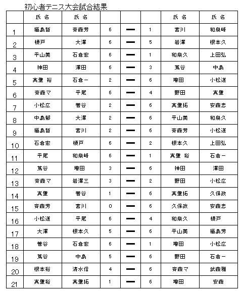 見事優秀な成績を残された方は、 菅谷、小松道、小松広、福島哲、榎戸、和泉久、平山、根本久、岩澤、真壁裕、真壁 拓、宮川、平尾、大澤、野田久、増田、石倉一、斎藤、斎藤奥さん、石倉和、澤田、 神田、和泉峰、上田、中島、真壁奥さん、根本裕、蔦谷、以上の方達です。 賞品として、ニューボールを一缶差し上げました。