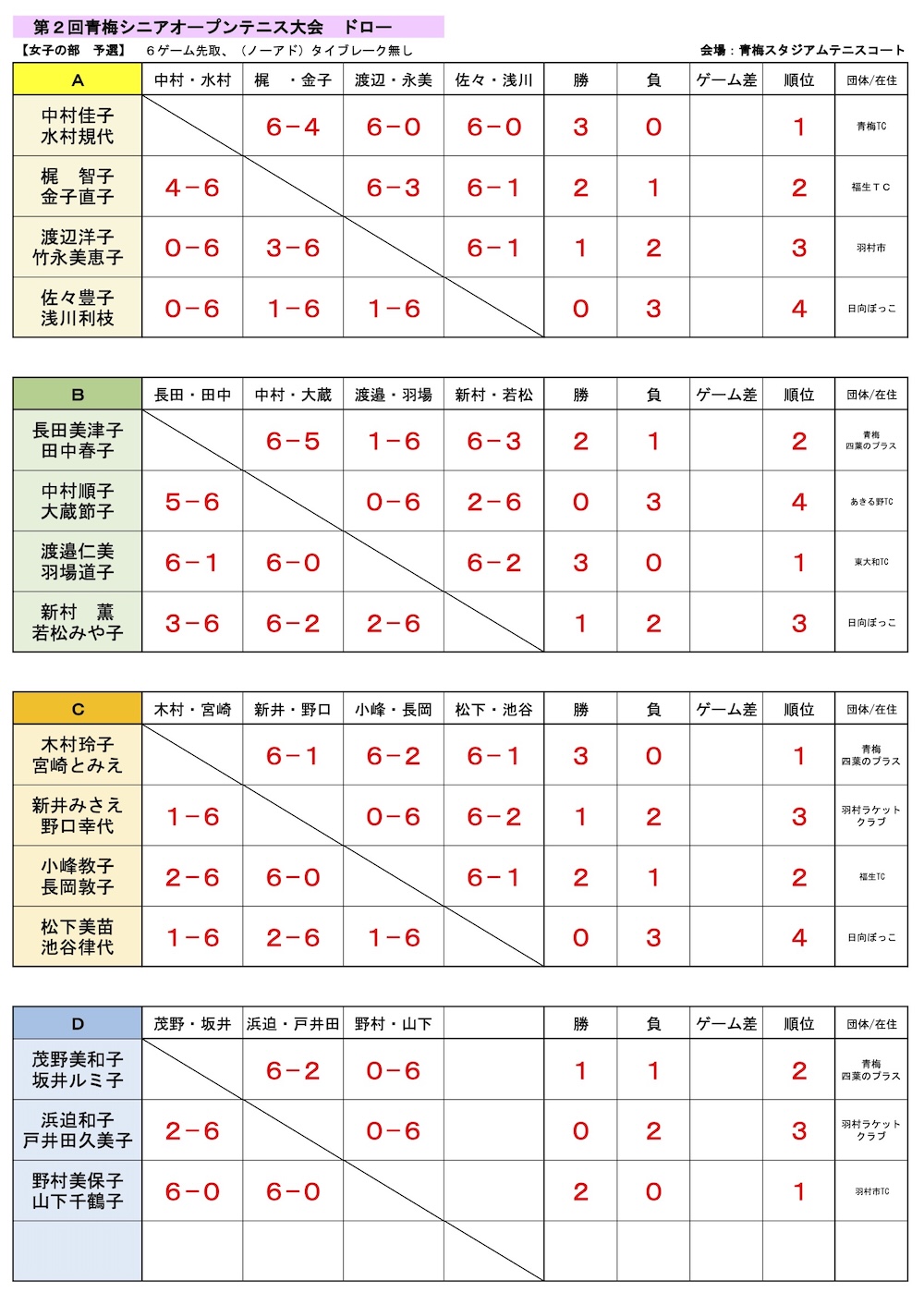 女子予選リーグ結果(青梅スタジアム)