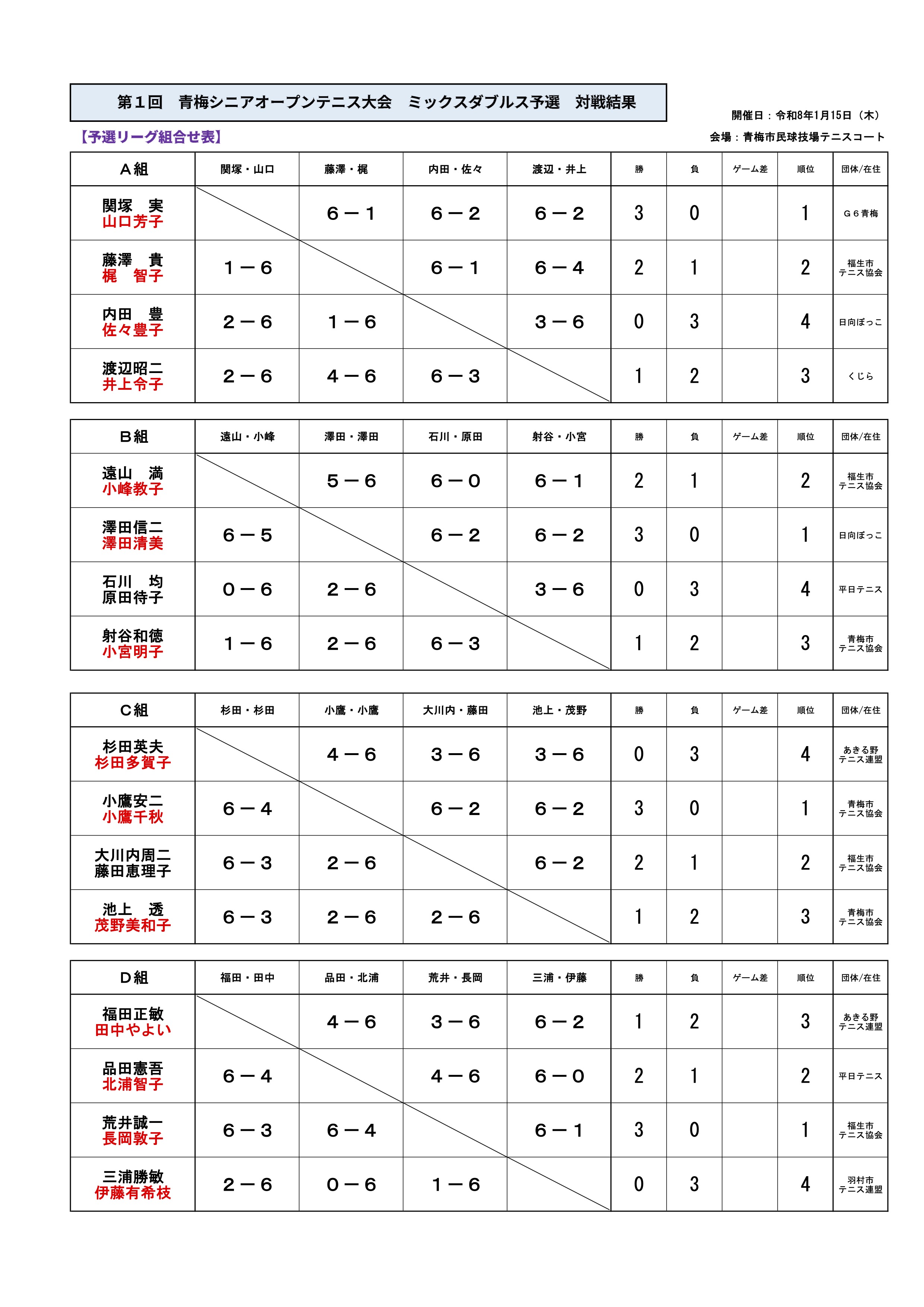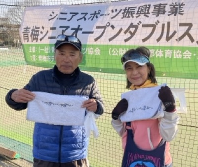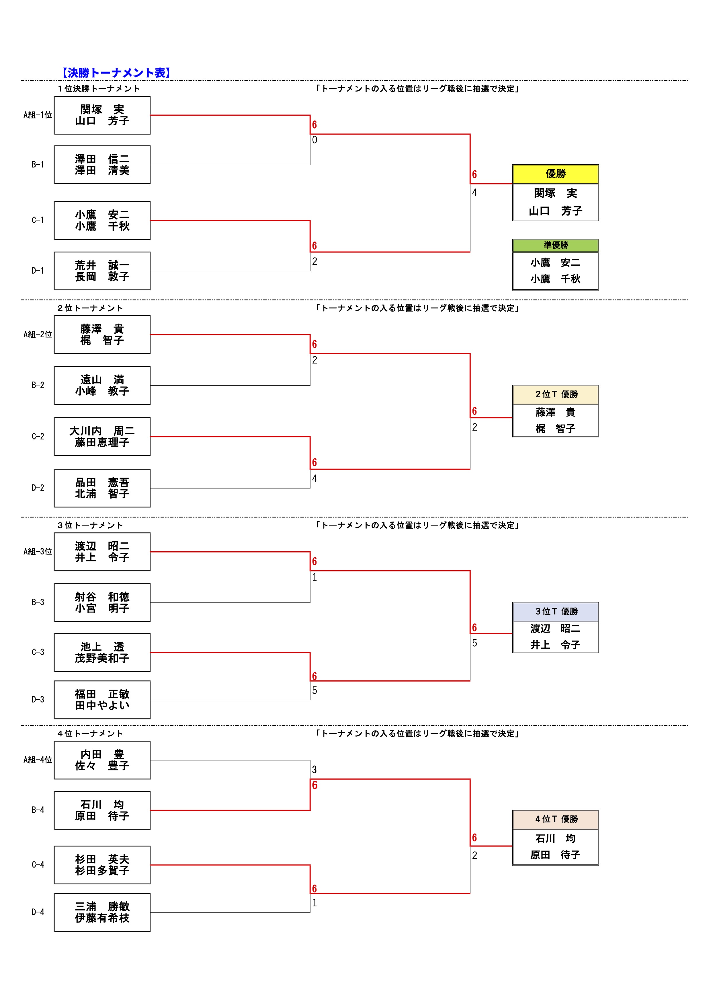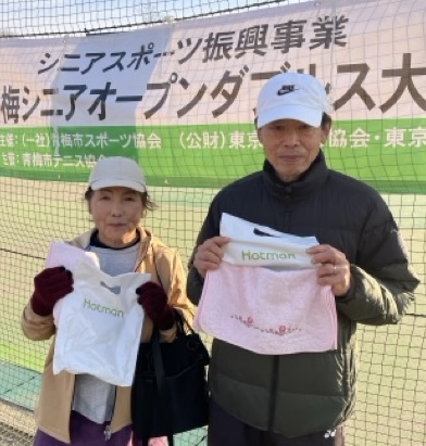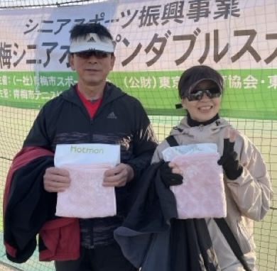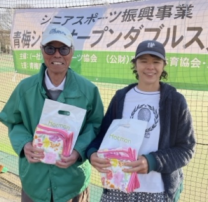 優 勝:山口芳子さん・関塚 実さん(G6) 準優勝:小鷹千秋さん・小鷹安二さん(青梅市テニス協会) 2位T優勝:梶 智子さん・藤澤 貴さん(福生市テニス協会) 3位T優勝:井上令子さん・渡辺昭二さん(くじら) 4位T優勝:原田待子さん・石川 均さん(平日テニス)