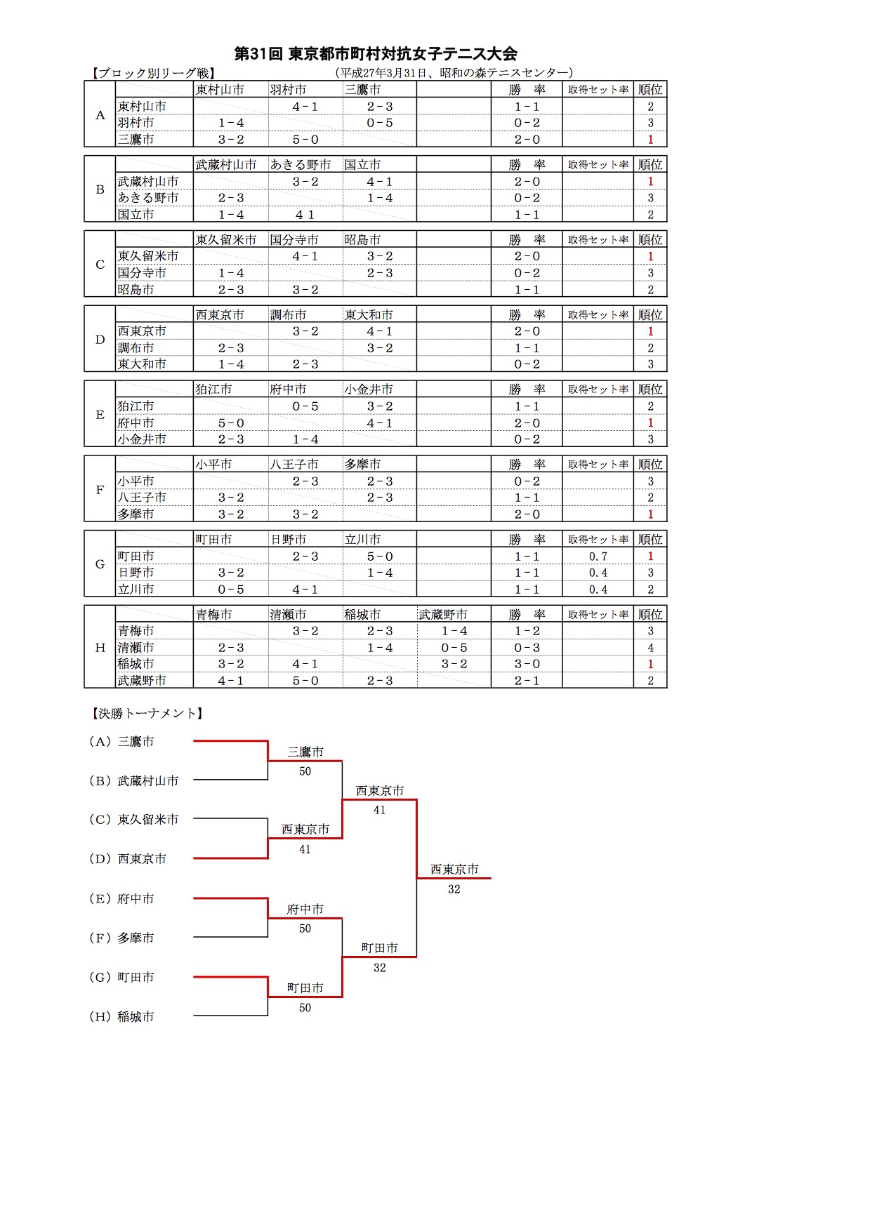 第31回 東京都市町村対抗 女子テニス大会 対清瀬 3−2 勝ち 対稲城 2−3 負け 対武蔵野 1−4 負け リーグ戦で敗退 |