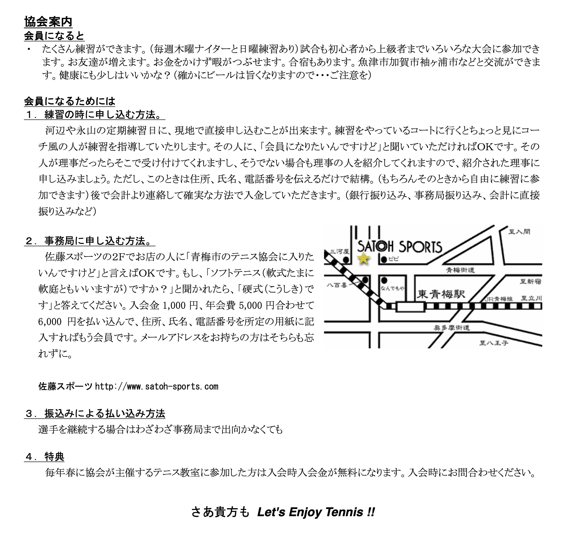 継続会員の方は5月末までだと年会費(5千円)のみとなります。 新規入会の方は年会費(5千円)と入会金(千円)を合わせて下記にてお支払いください。 6月以降は入会金(千円)も必要となりますのでご注意ください。 ・できるだけ総会時に支払っていただけると助かります。 ・練習日にコートで会計担当に直接手渡してください。理事も受け取れません。 ・事務局(佐藤スポーツ)で支払ってください。 ・振り込む場合は以下でお願いします。(お薦め) 振込先;ゆうちょ銀行 口座番号:10170−42256791 口座名義:オウメシテニスキョウカイ ・ゆうちょ銀行以外の金融機関からの振込は以下のようにお願いします。 【店名】〇一八(読み ゼロイチハチ) 【店番】018【預金種目】普通預金【口座番号】4225679 注)ゆうちょ銀行の口座番号から最後の1桁がなくなっています。 振込手数料は振り込んだ方のご負担でお願いします。 振込方法により手数料が変わります。(0円〜146円) なお、新規入会の方で振り込まれた方は、 必ず次の情報を池上(ikesanz@mac.com)までメールしてください。 メール件名は「新規入会」としてください。 漢字氏名 ふりがな 郵便番号 住所 携帯番号 自宅電話 勤務先 青梅市内、青梅市外(派遣試合の時の参考にすることがあります)